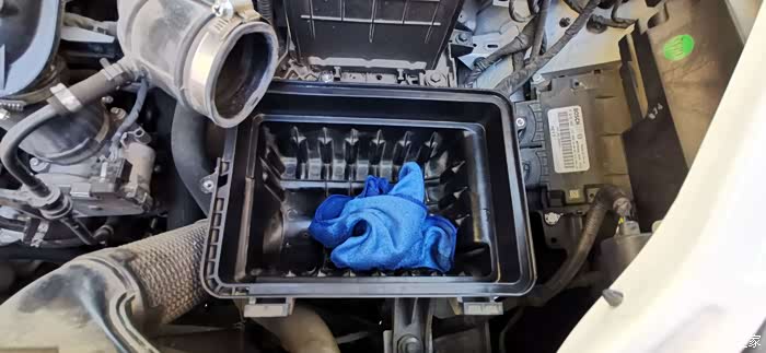 拆掉旧的空气滤清器后,把安装空气滤清器的下壳,清理一下卫生,擦除灰尘等等,但要注意抹布不能太湿,有点润湿就好。