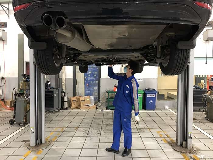 师傅正在仔细检查黒朗的底盘部分,首先检查外观件有没有剐蹭已经破损的地方。