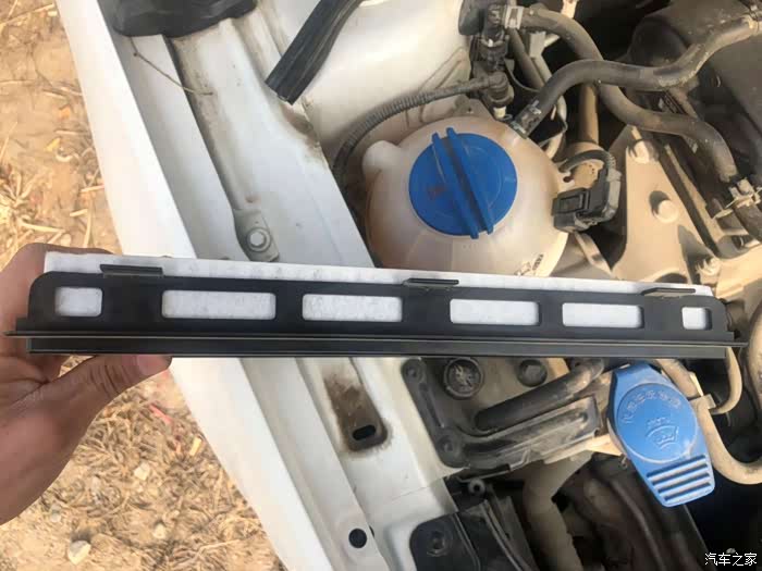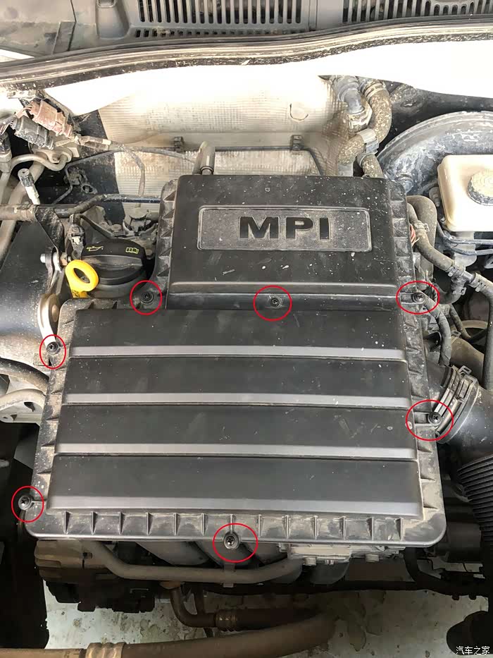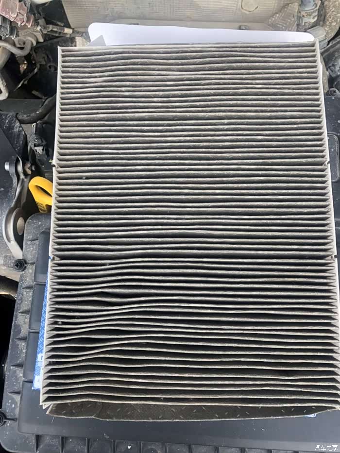 工具只需要一个扳手,用十字螺丝刀把这七个螺丝松开,螺丝直接在上盖上就行,不用拆上面的螺丝把盖子拿下,直接松掉螺丝之后把这个盖板从最下面螺丝处把盖子掀开,把旧滤芯拿出来就行了。滤芯不是正方形的,不用担心放错了。(来车子有点脏,今天没时间洗了,明天洗洗车。)