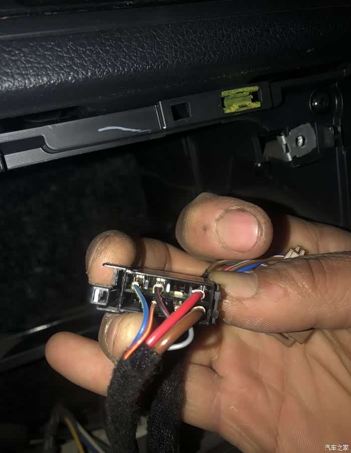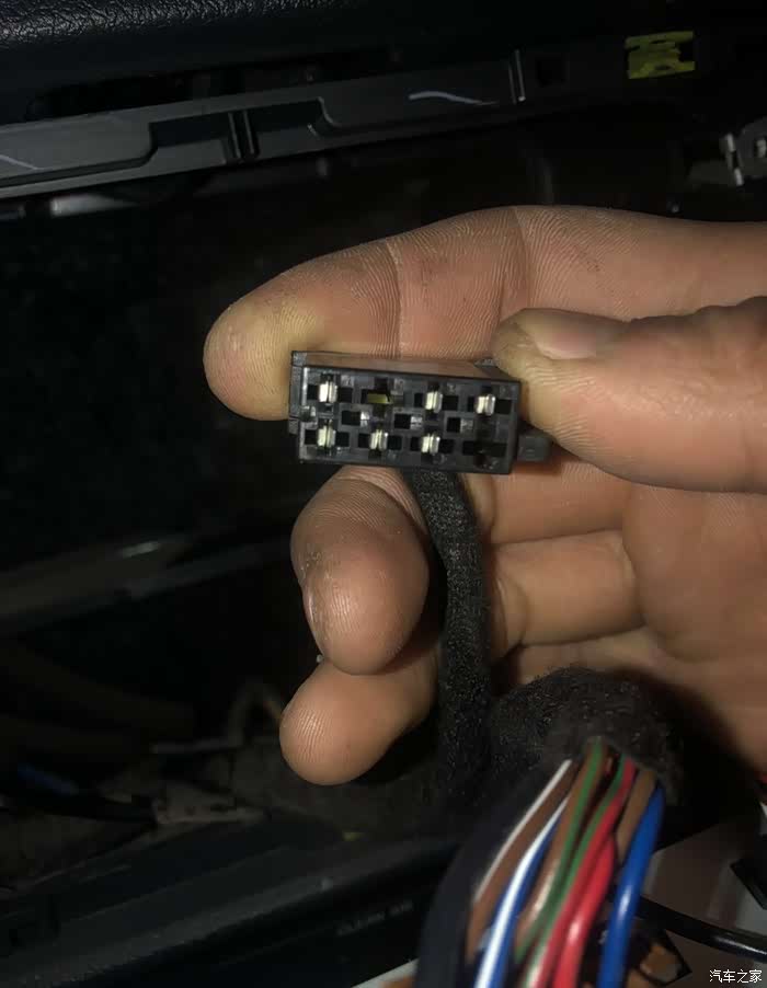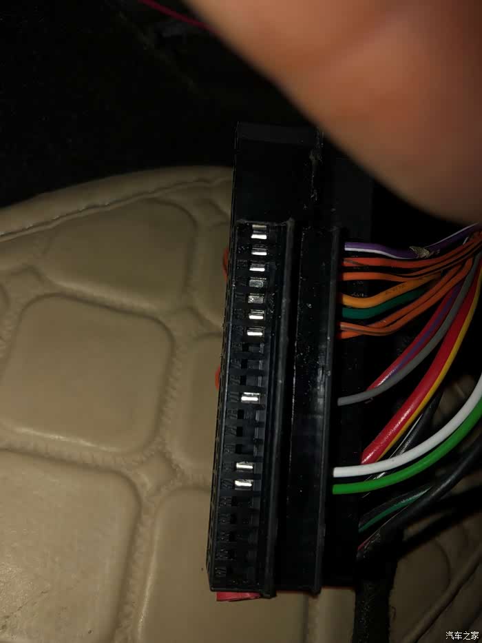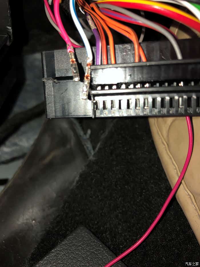 用铁针摁住露出来的针脚贴片把线拔出来,20和21同时拔出来后就空了。用别的线卡上针插入18、19号针脚后打开ACC钥匙发现可以连接蓝牙和方向盘控制,可以说就是他的问题了,毛病找到了面临着另一个难题怎么并联上,没办法,自己想办法接吧,又不想破线,最后绞尽脑汁想了个办法,把18针脚先挑出一个用电烙铁焊上别的线在连接CAN与CD连接线的端子上,然后归位。接着再用同样的方法弄19号针脚,最后完工可用了。