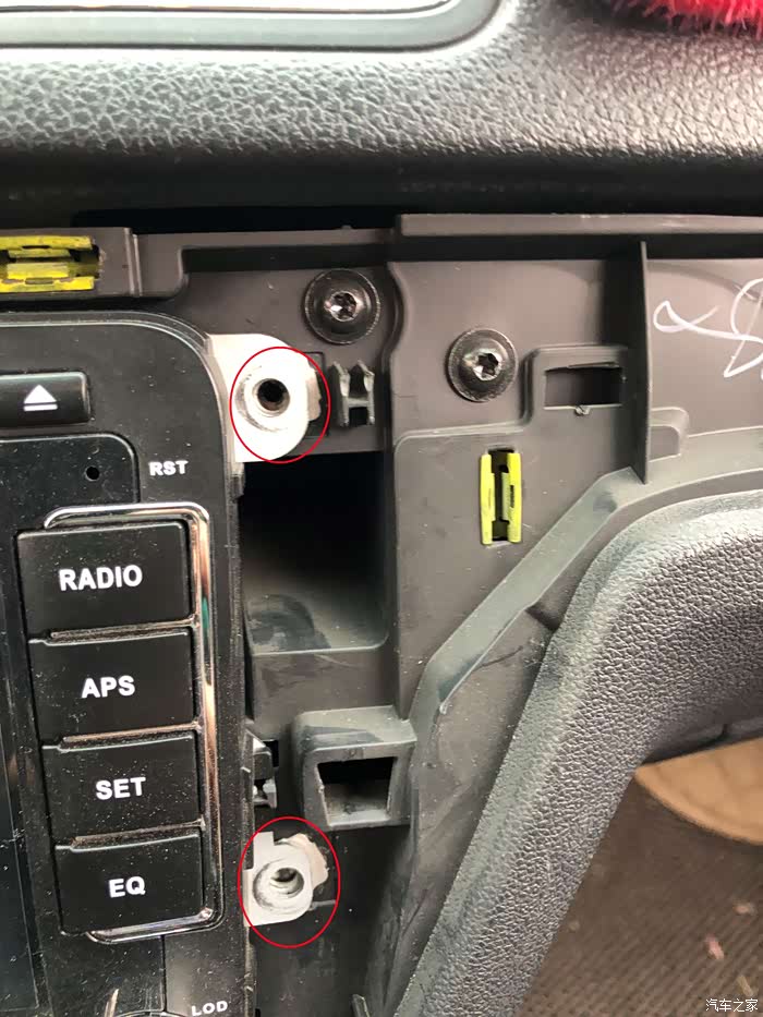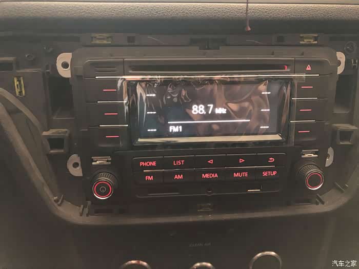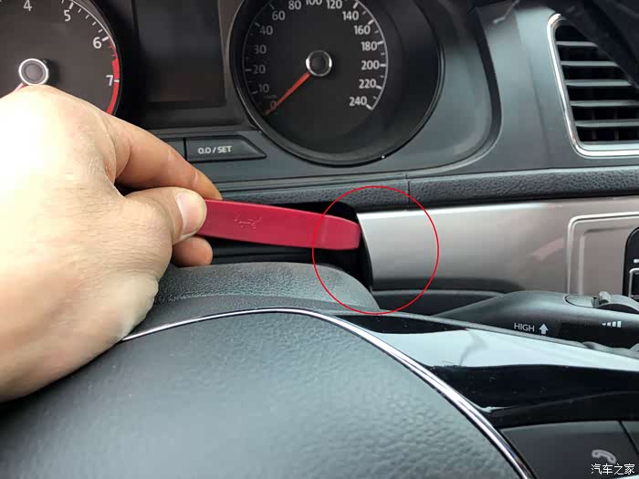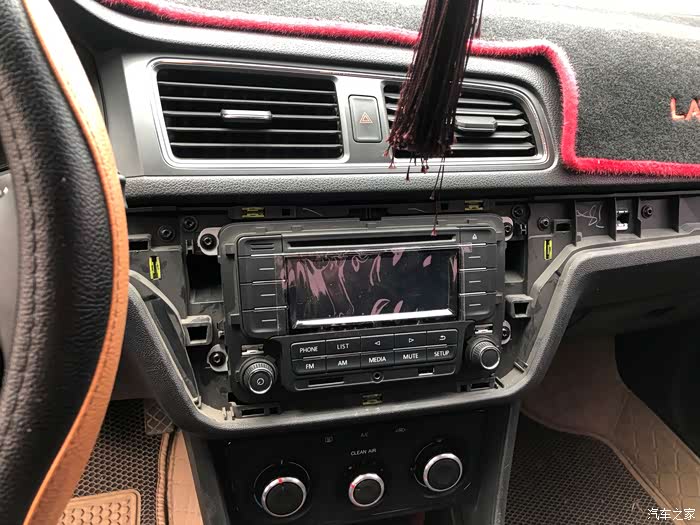 拆卸前面板。17新朗逸的前面板由卡扣固定。所以拆卸前面板只需用撬板将前面板撬下来就行了,个人感觉这个地方是最容易翘起的地方(翘板沿一个方向直线翘拆)。