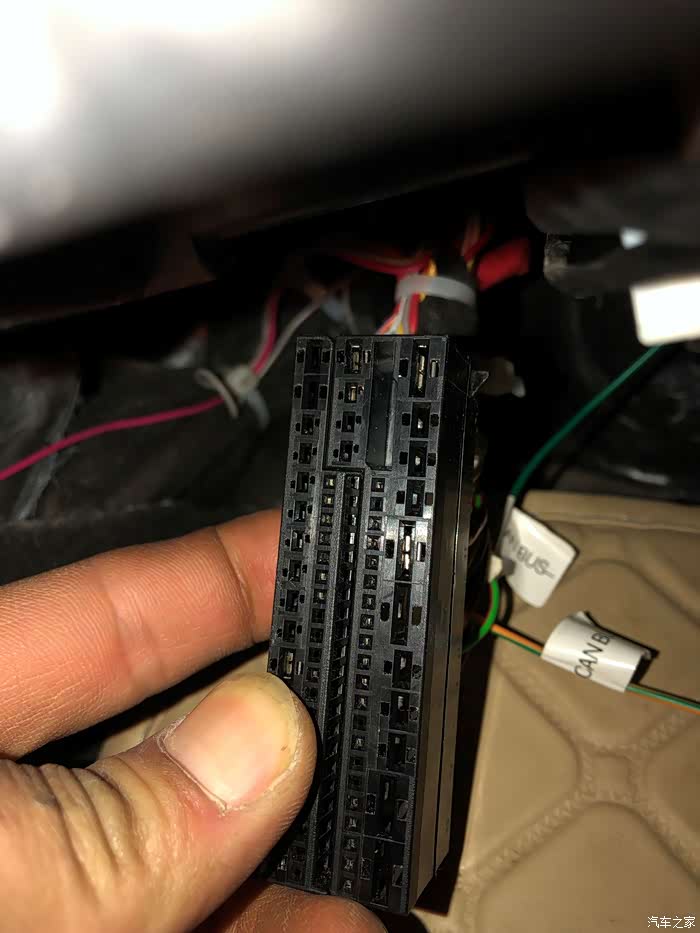 安装新车机,原车机线束插头安装,杂牌导航车机安装时没有更改线束插头,直接把插头插回原车机就可以,所以安装是比较省劲的只要对插就好了上电测试,虽然开机正常,收音机也能用,但是蓝牙还有方向盘控制都不可以用。自己也知道大众方向盘控制需要网关协议控制,难道改方控的时候我的线接错了吗?最后检查CAN协议发现也是接对了的,两根线插到BCM20、21针脚上,为什么不行呢?网上查的是朗逸网关是20和21号针脚啊!但是接上之后不可用,随后继续网上查,发现也说是18和19号针脚的,只能拆下来试试看了。