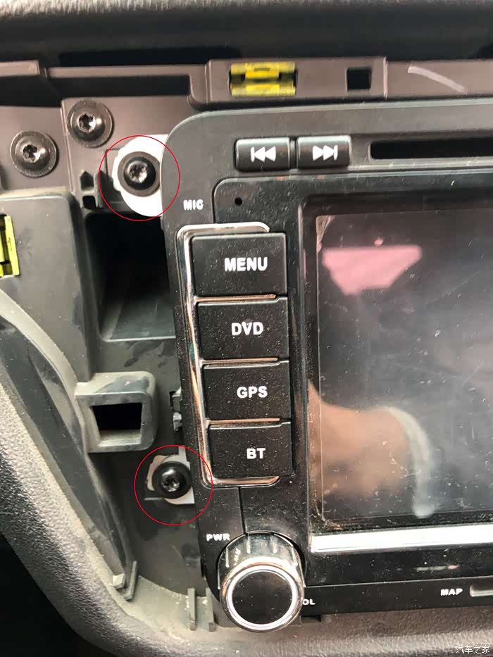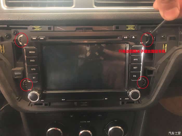 拆掉装饰板之后就可以看到我们朗逸车机的原貌了。朗逸车机使用的是米子花螺丝固定,所以这一步需要我们使用米子花螺丝刀将四个固定螺丝拆卸下来。