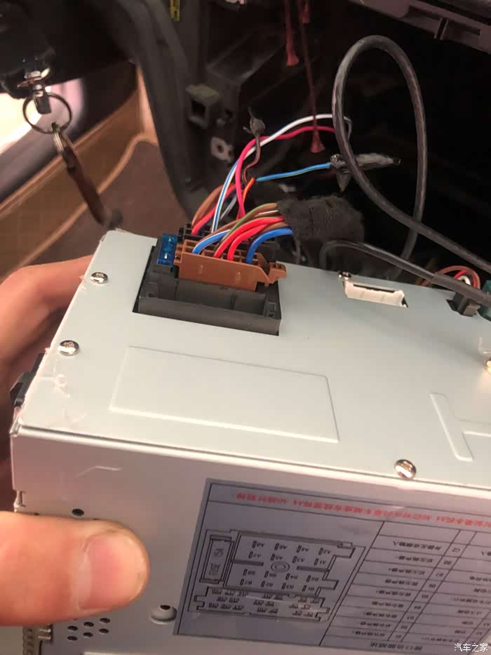 将固定车机的四个螺丝拆卸后,就可以拔出车机,这里可以看到车机线束很少,总共三根线束,拔掉插头车机就拿下来了,到此,拆卸部分完成。