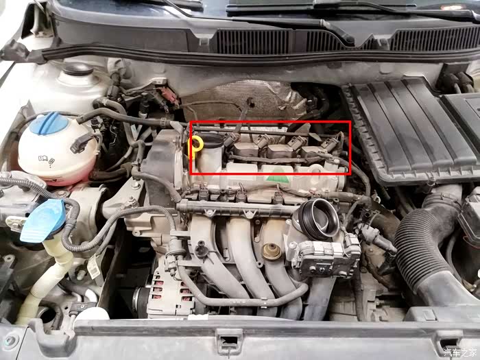 朗逸的火花塞一共有四颗,就是红色框框标识的地方。