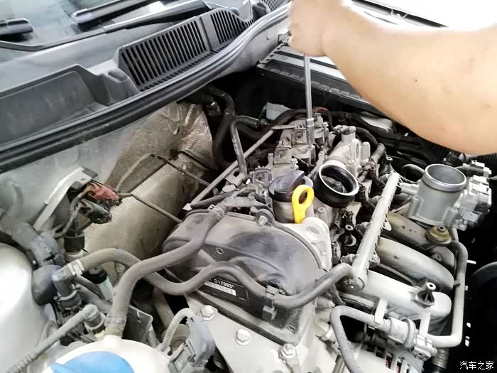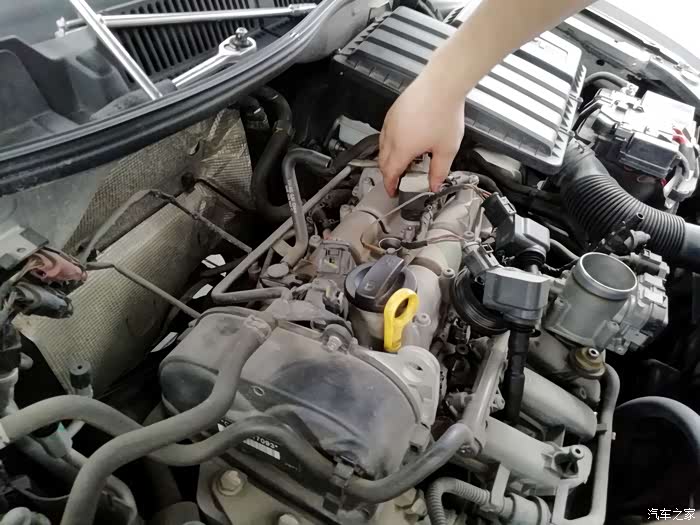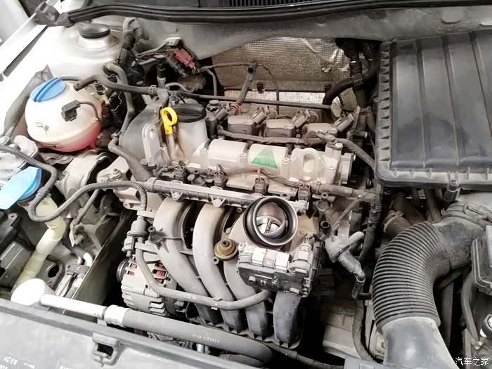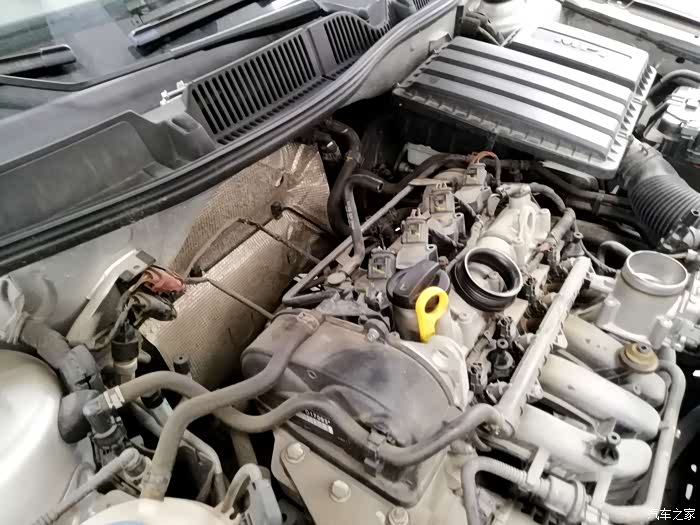 打开发动机保护盖,发动机的真容露出来,这样子有点丑啊。积了好多灰,还没有真正清洗过发动机仓。