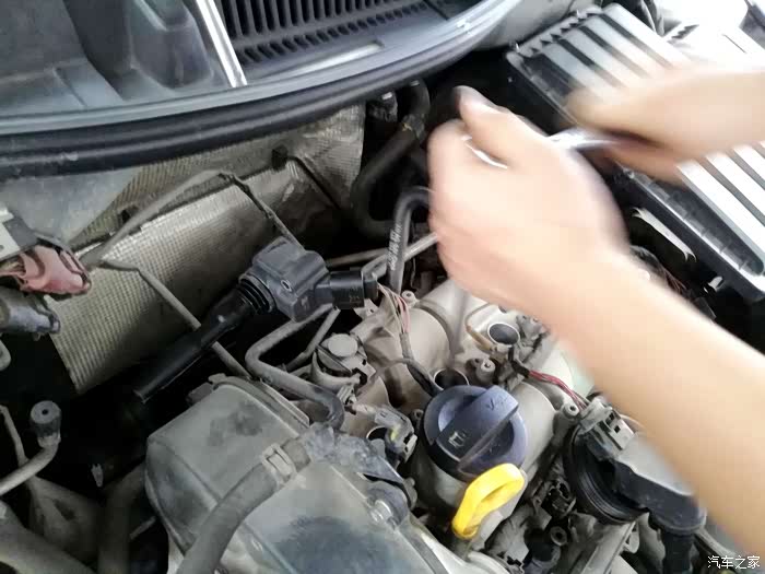 先用套筒扳手将火花塞的固定螺丝取掉。
