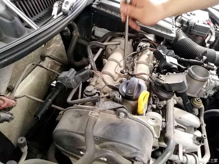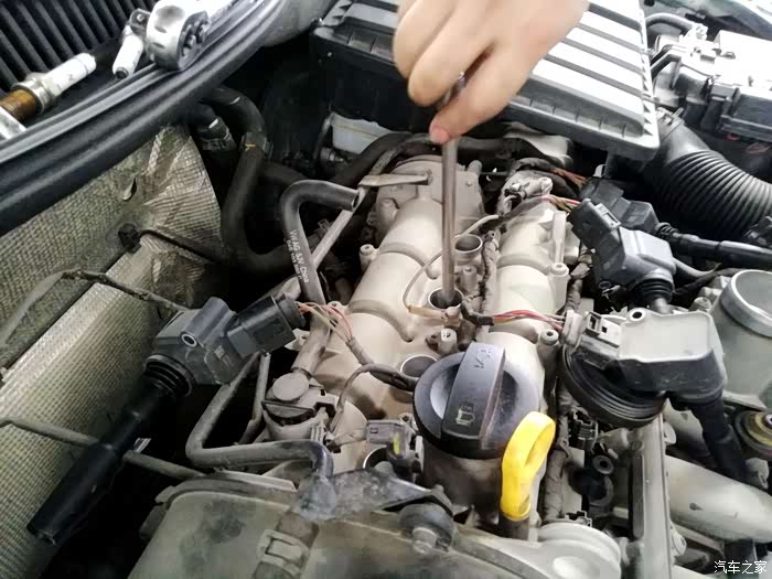 再去特殊加长的套筒扳手伸到火花塞的安装孔位内,旋转镙丝将火花塞取出。