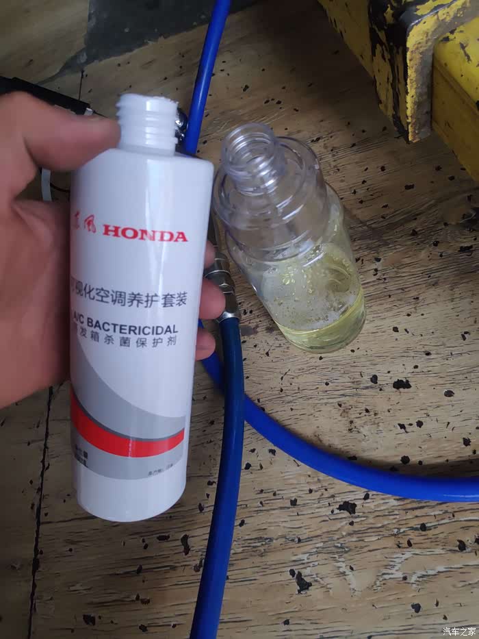 注意的是这个设备要另外接气源的,也就是压缩空气。清洗完了这瓶清洗剂接下来就是喷洒本田原装空调蒸发箱芯的保护剂了。设备倒入保护液。