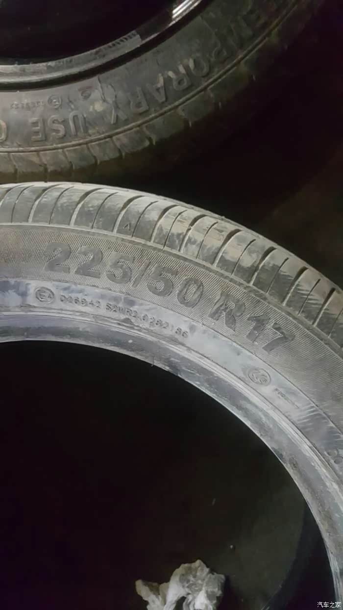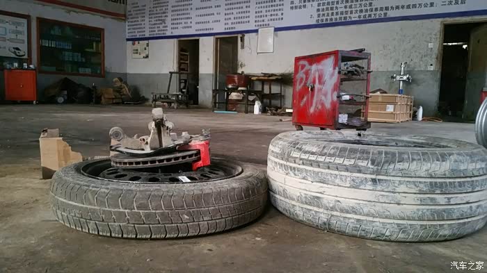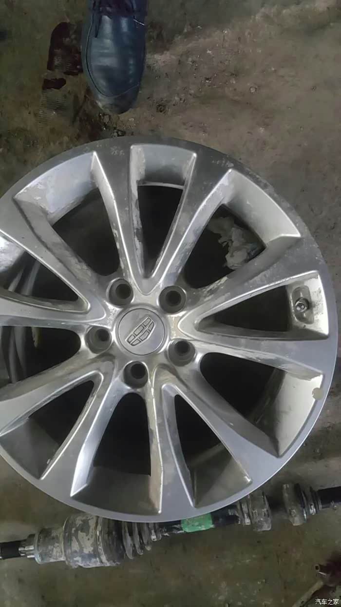 17寸大脚,吉利认证,拆下来数据测试偏摆达到400多,只好换新 ,新轮毂图忘拍了。和这个一模一样,里面还有胎压检测模块,没有拍照。