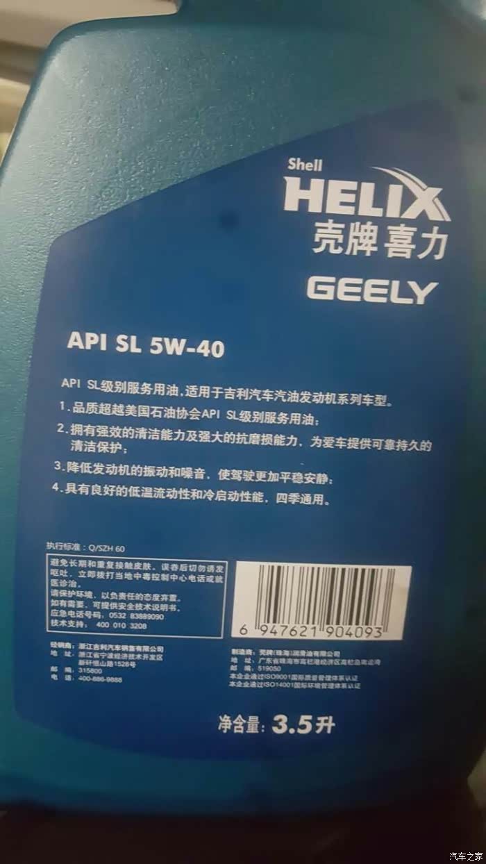 壳牌认证,帝豪GS专用机油,普通半合成APL/5-40W级别的不是太懂。