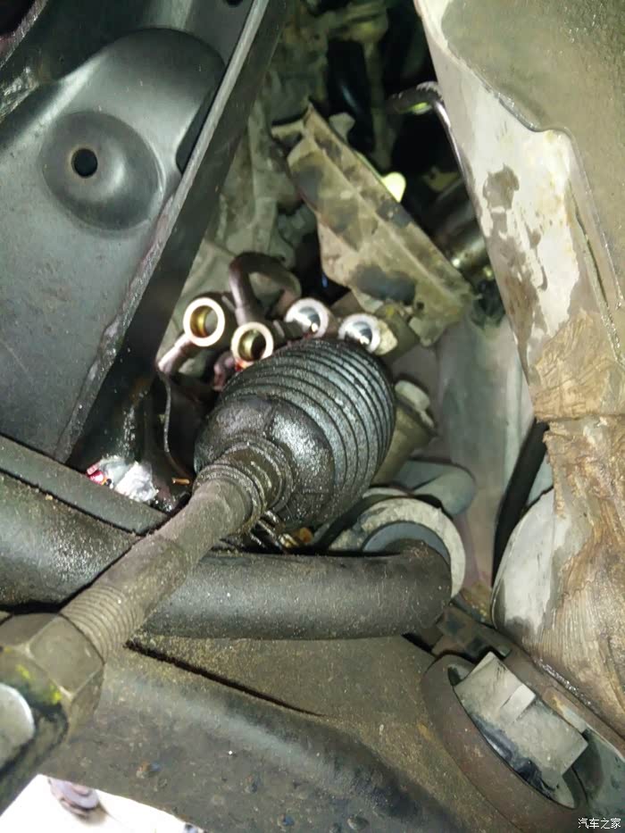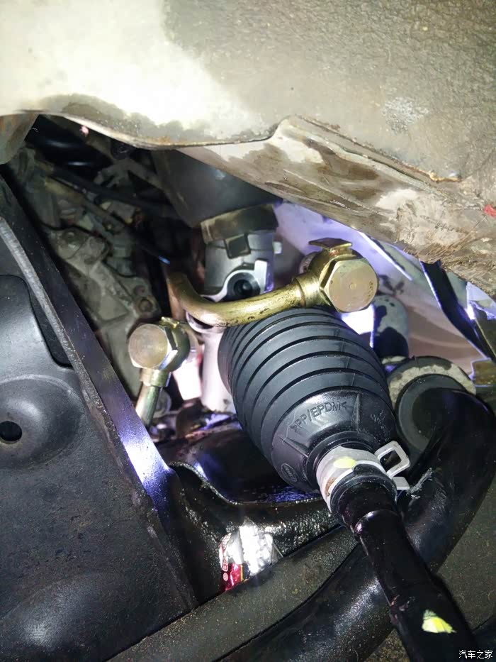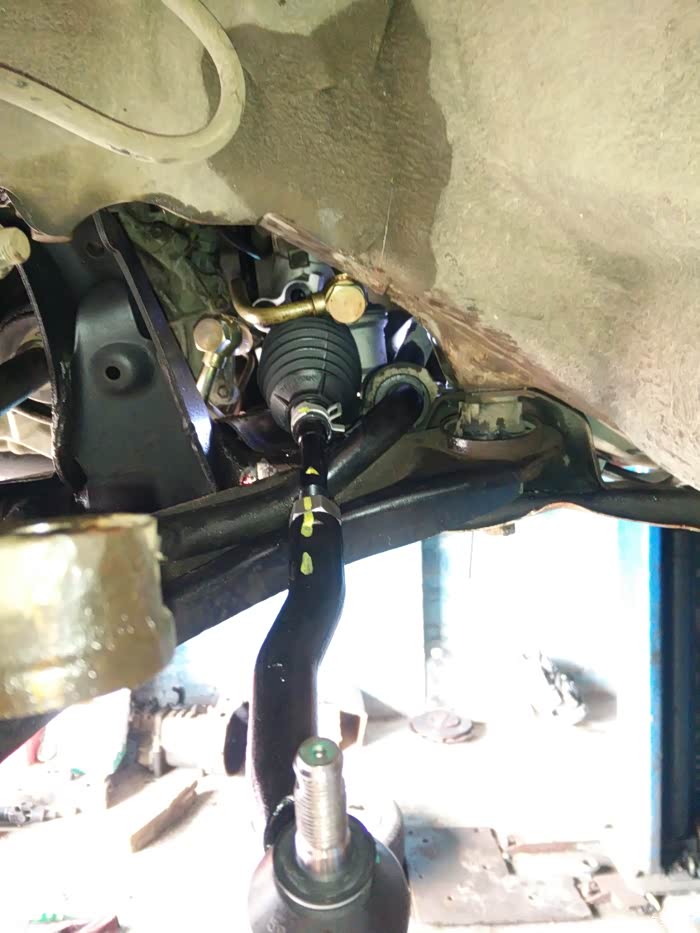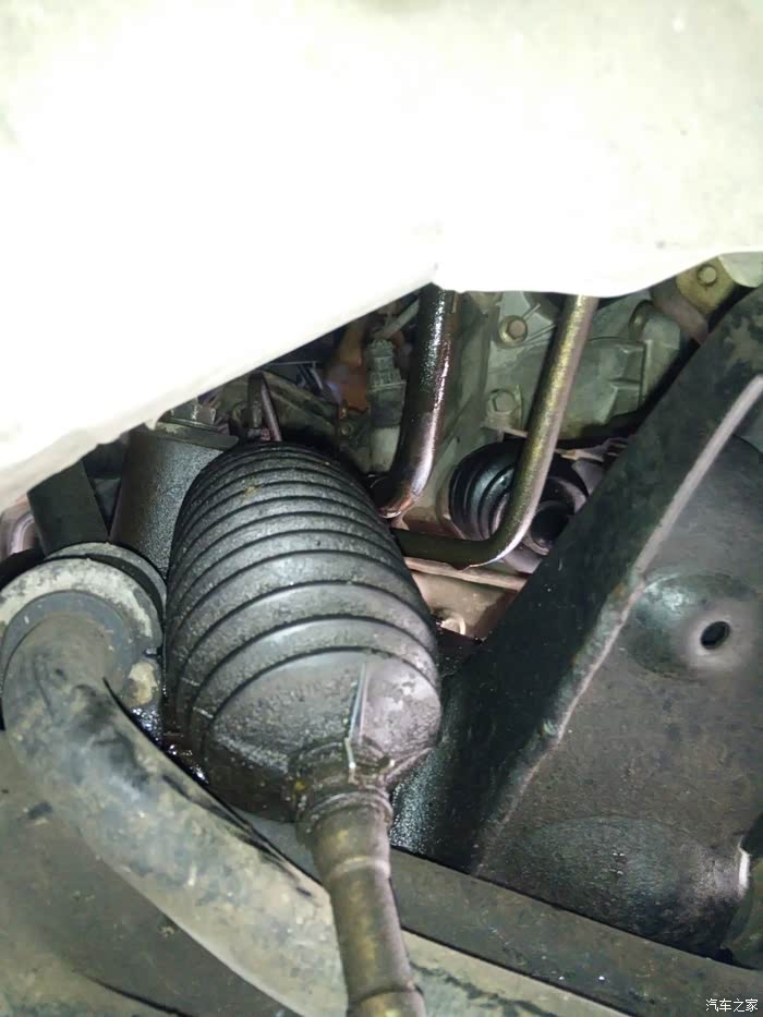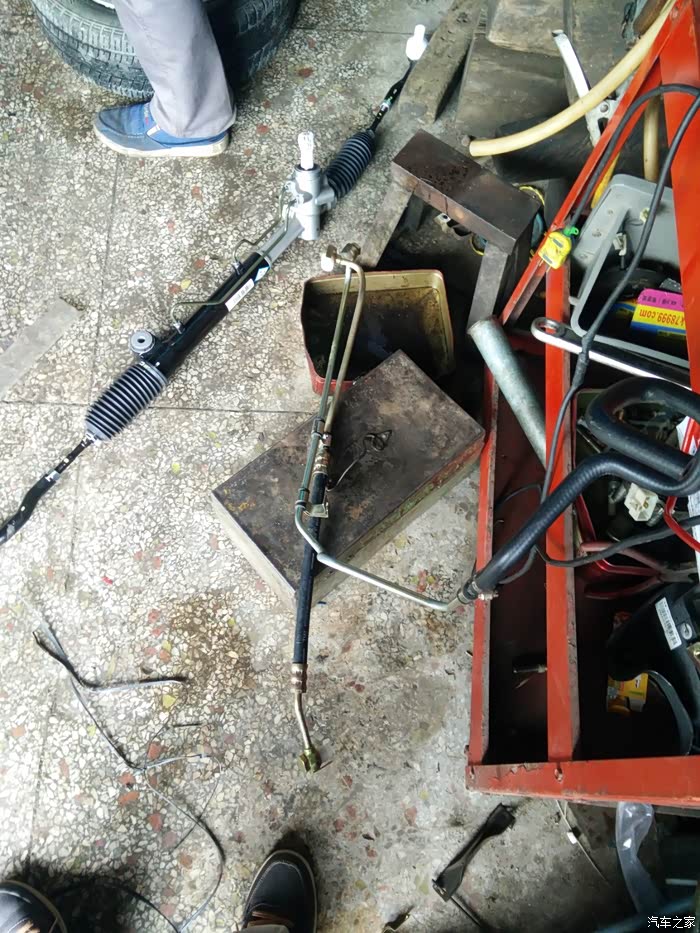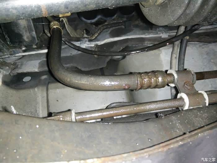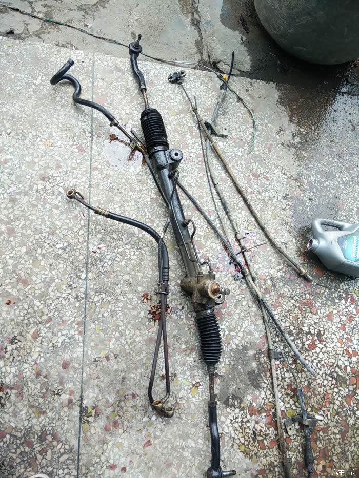 今年上半来漏油严重多了,着车台速几分钟后地上也会有油了。好吧,老早就已经买好方向机总成了,趁着清明假期有点空,车方机回老家把它换,谁知道去修理店把车升起来看,不得了,底下漏得太多油了,方向机油喷到左边轮边都有,然后着车再看看,不得了,高压管也漏,比方向机漏得多。