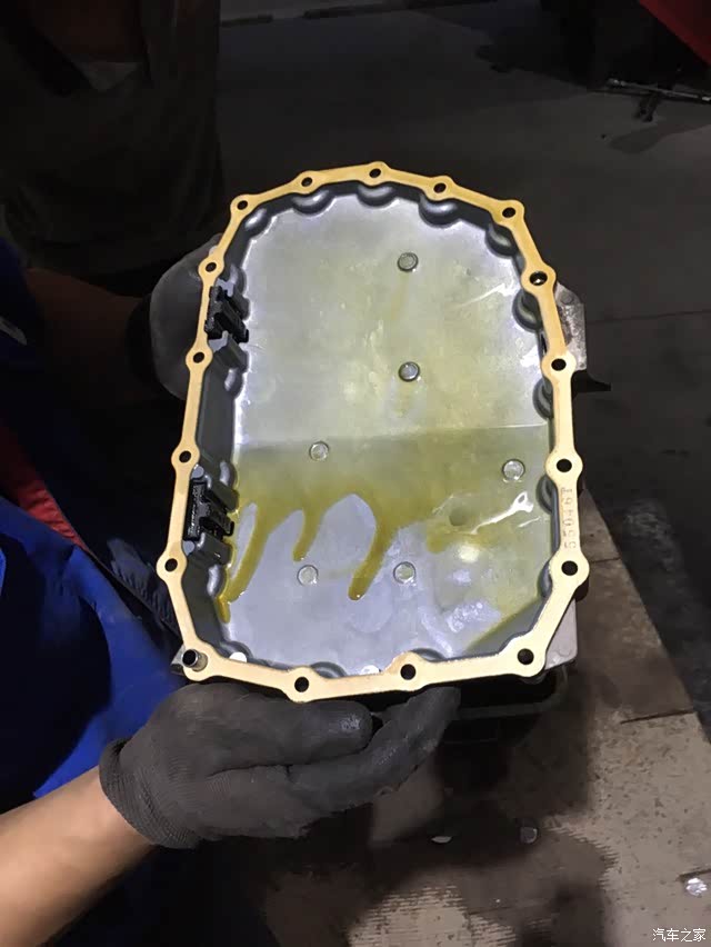 刚拆下的油底壳螺丝孔位上的淡黄色是油底壳衬垫