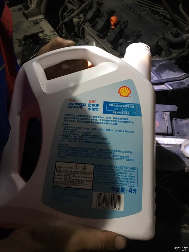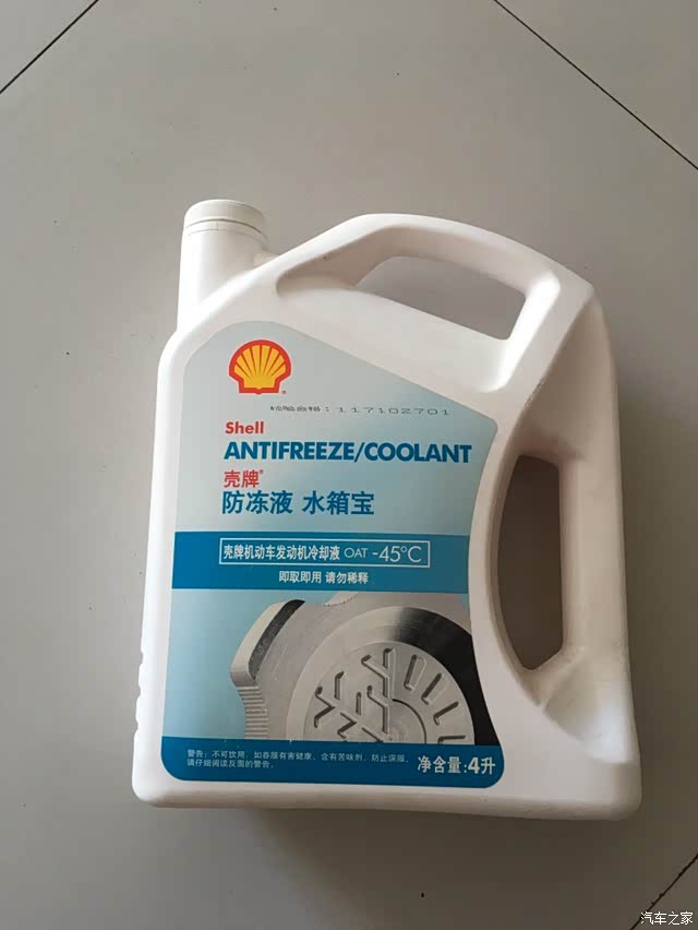 水箱有点缺水,备用水壶里也空了。考虑到使用年限,直接更换。壳牌水箱宝-45℃,这里需要提示一下,如果你不换而是添加,一定选择同品牌和同颜色的。不同颜色内里的配方不同,混加会发生化学反应。堵塞水路甚至腐蚀水箱。而且最好选择一些比较知名的品牌产品。