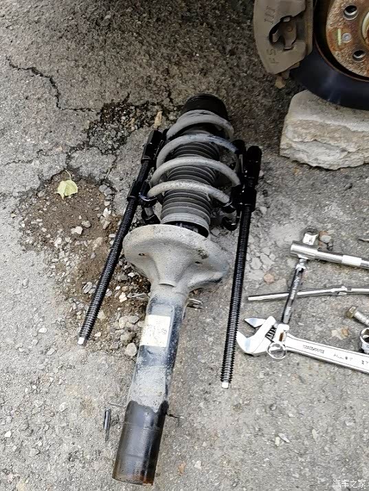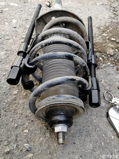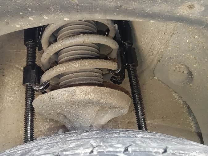 在拆轮毂前,把减震弹簧压缩器以六角端在上,挂住弹簧(尽量多挂住圈数),以手劲拧紧螺杆。