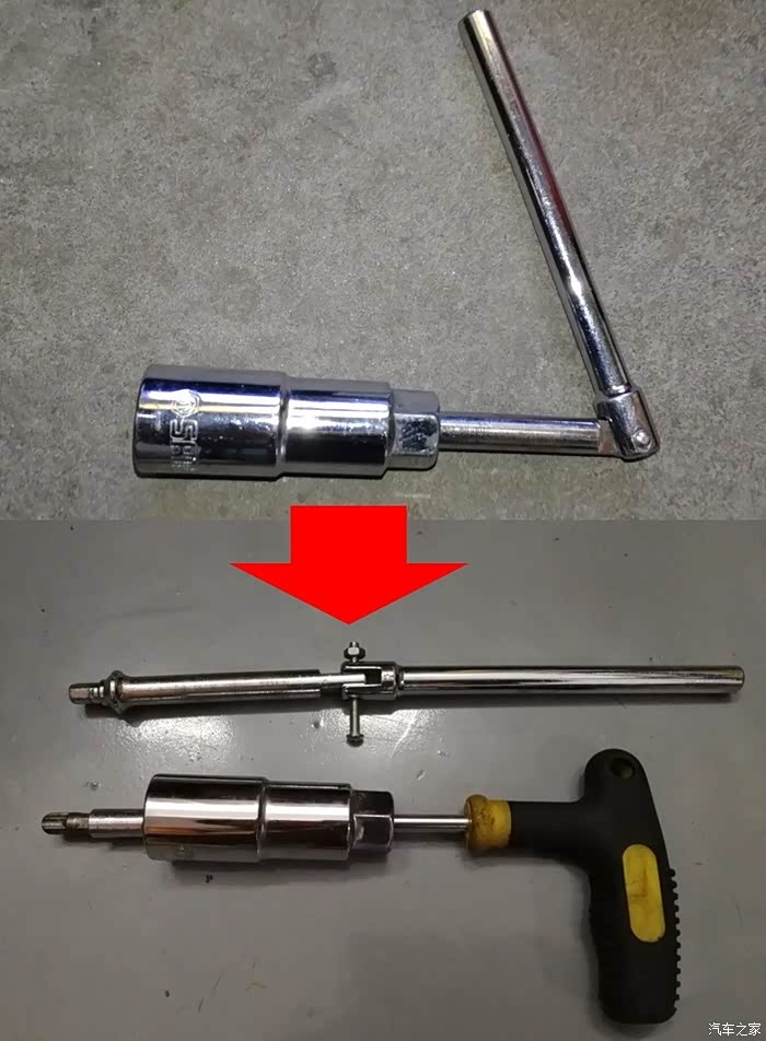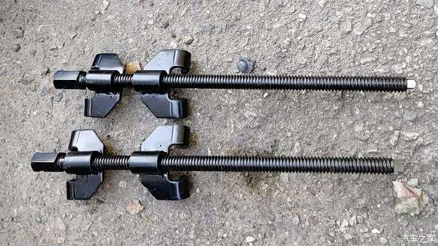 先对减震弹簧压缩器作个小改动:在螺杆六角的另一端,修磨出一个四边形来,以便可用扳手拧转。