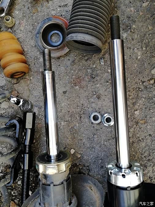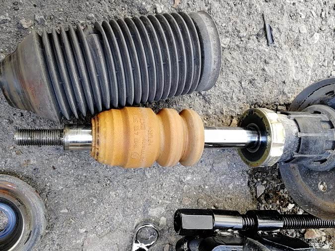 一次对车的检查中,发现后减震胶已老化断裂了,减震筒也有漏油现象。因以前换过前后减震胶,自认为还是个轻松的活。遂购入一对后减震胶,午间工休时间更换时却发现,右后减震器阻尼尚存,自动伸出已无;左后减震器连一点阻尼感也荡然无存了。仔细回味行驶感受,并对比了下同类型车新车减震器处按压回弹情况,基本能判断,前后减震器已需更换了。