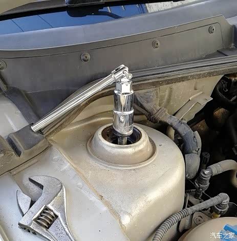 用专用套筒扳手拆卸减震器上盖板,两颗螺母可全部拧下,也可留下压平面轴承的螺母。