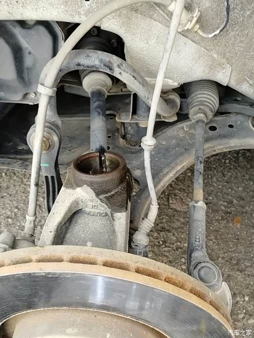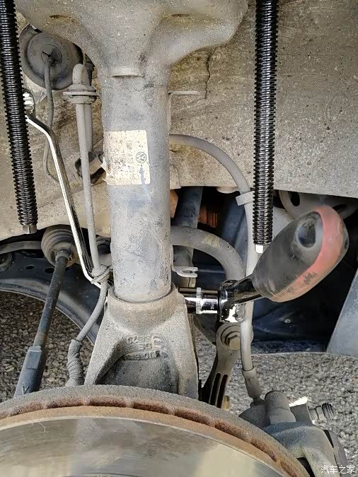 用千斤顶抬起对侧车身,直至扭力杆吊耳与三角臂安装螺孔对齐,拧紧连接螺杆。拧松并取下弹簧压紧器,观察弹簧上下落位支撑盘无异常。装复轮速线。把顶升对侧车身的千斤顶移过来抬起车身,装复轮毂就算完成一个了。