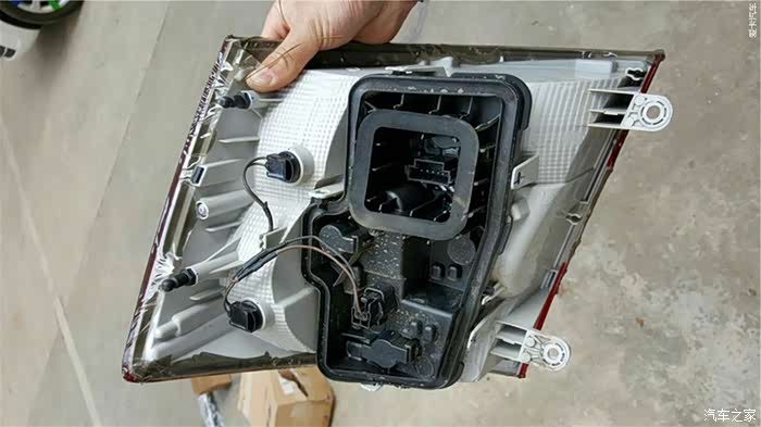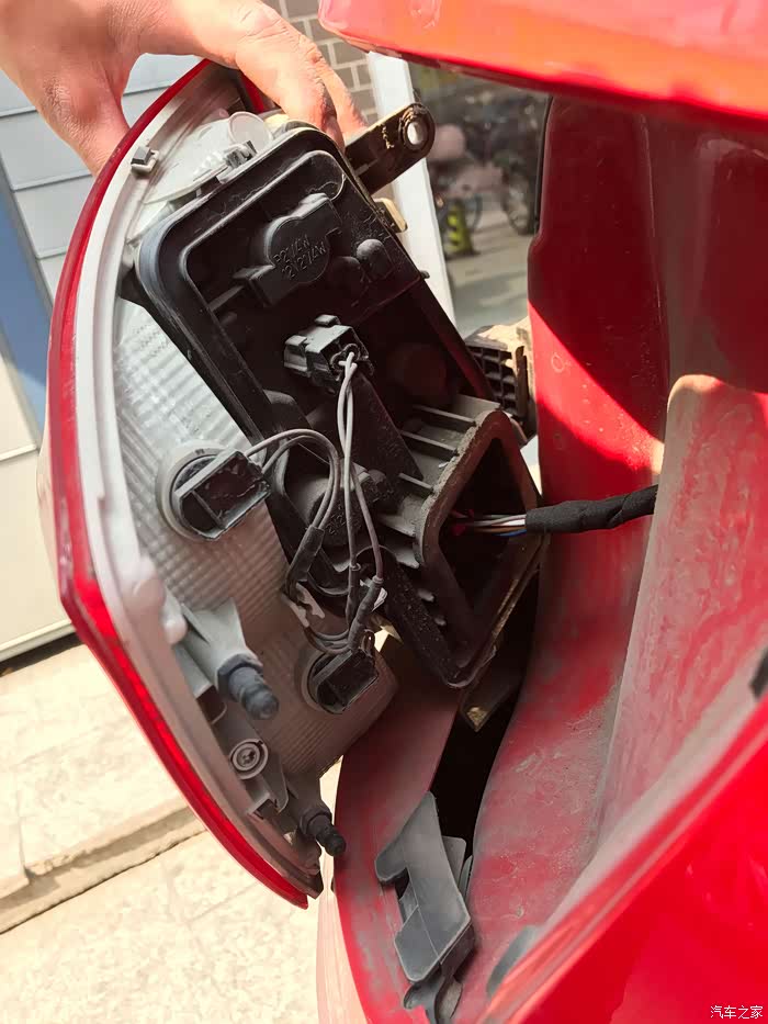 尾灯内侧照片来一张,左边下面那个黑色灯座因该就是坏掉的那个,往左已转就可以拔出来了
