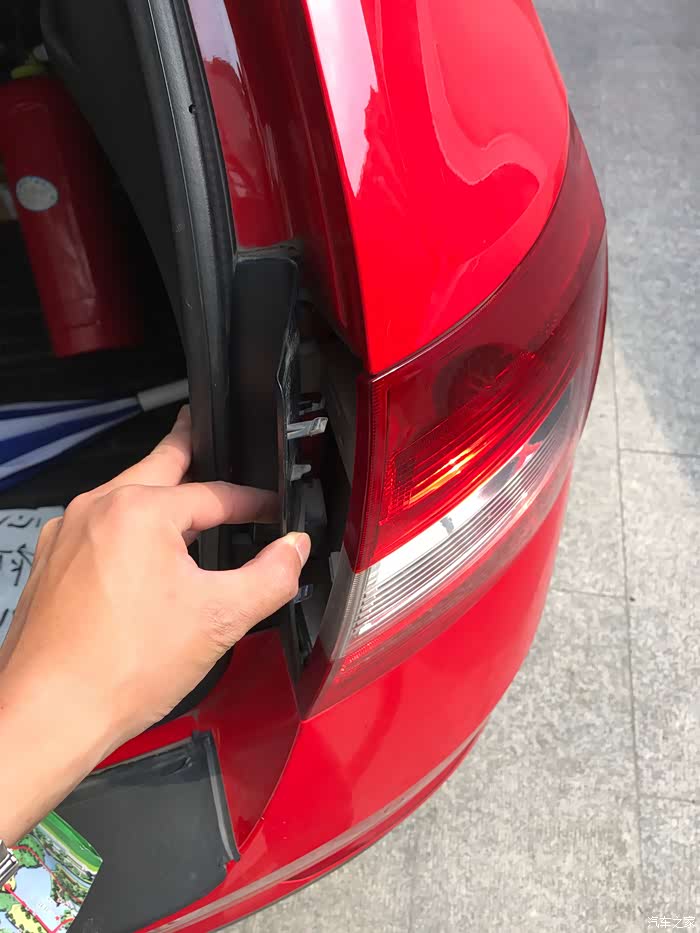 第二天上午拿了一把梅花螺丝刀和一个一字刀就直接开拆了,拆尾灯过程下方几张图片基本能够诠释过程了,就是撬那黑色塑料盖板时一定要从尾灯一侧撬起,不能从尾箱口撬不然卡子会断,切记!!!
