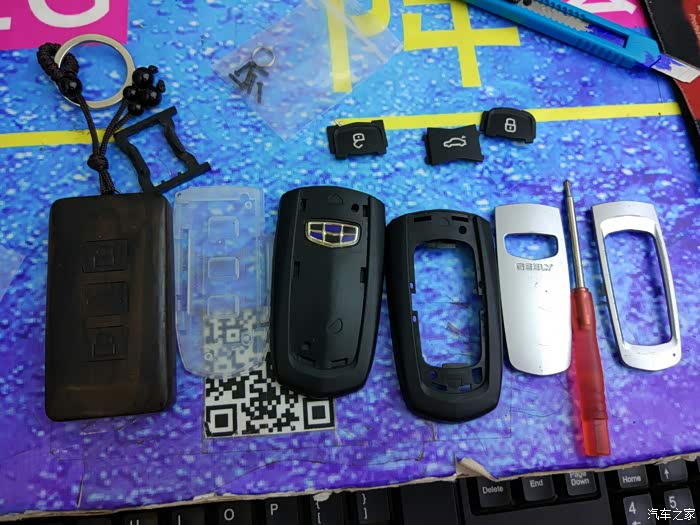 这个是拆解过后的原装钥匙,侧面有一条缝隙,直接刀片插进去就可以撤开!比较简单!