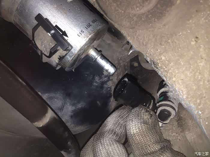 地上铺好报纸,找一套平时不穿的旧衣服裤子穿好,准备好一副手套。如图所示,发光的地方正上方就是昕动燃油滤清器的位置