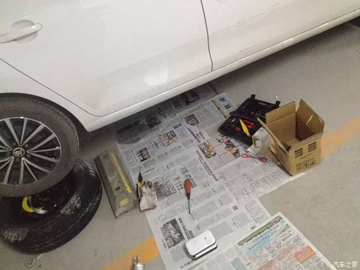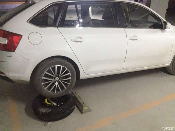 先把车开到停车库车少的位置,拿出备胎。把备胎放到停车限位器后面,一定要放到限位器后面,不然后轮开不上备胎。然后把车倒上去。有条件的可以找个地沟。右后轮一定要压在备胎的中心位置,不然怕车滑动,拉好手刹。