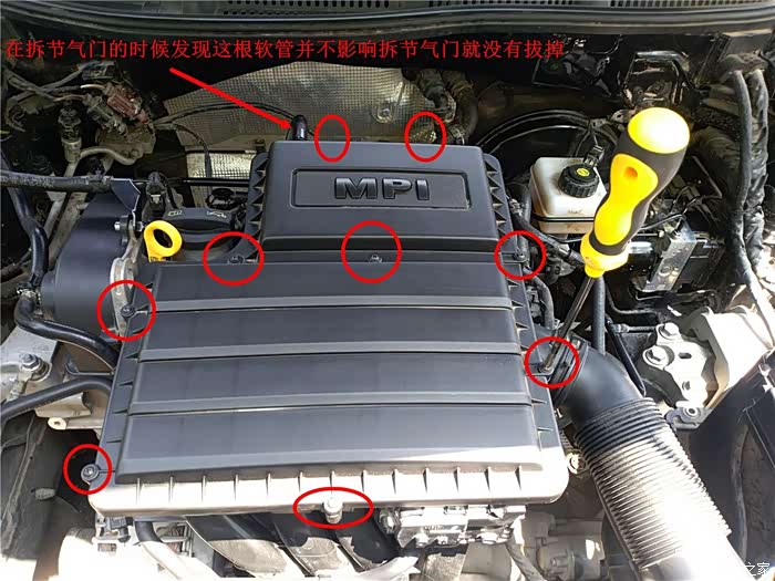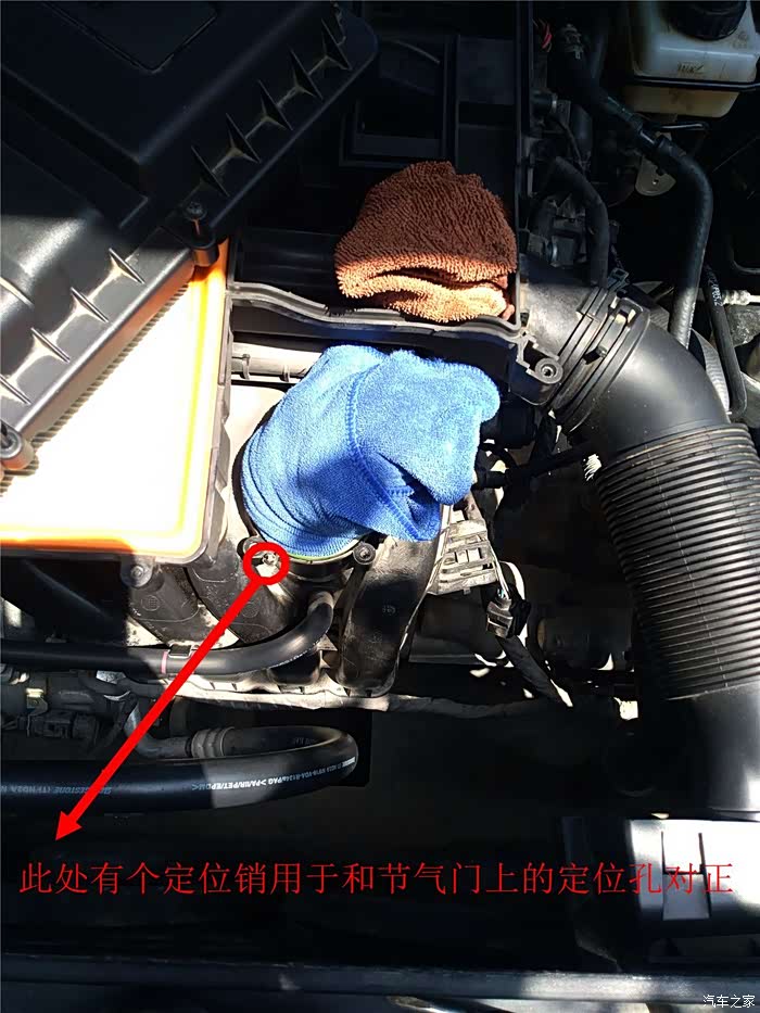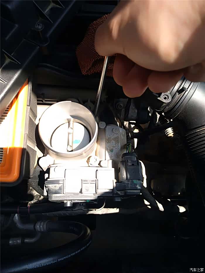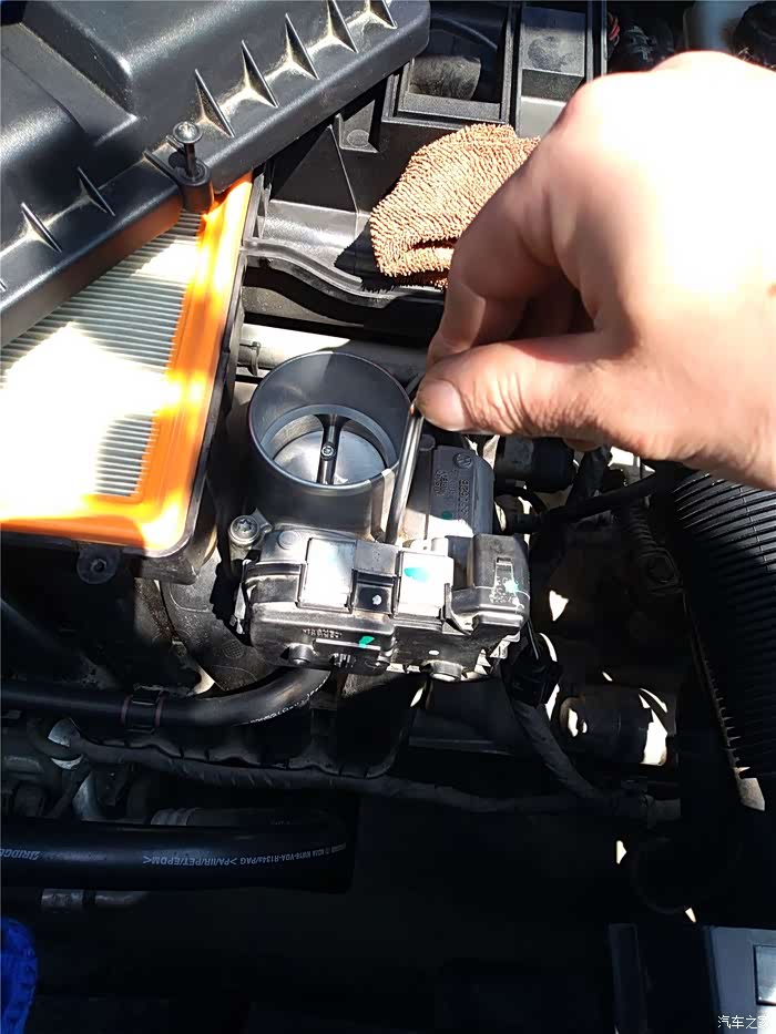 在喷洗清洗剂的下方铺块布或者用容器接住,如果只是先喷后擦的话不用担心喷下来的清洗剂会流淌机舱内,因为先喷后擦清洗剂用量不多而且清洗剂本身易挥发。此方法我觉得可行能够有效清洗节气门的正反面,缺点就是有线束束缚操作不是很方便。如果说不拔掉线束就不用匹配的话,那么这两种方法清洗完之后就不需要匹配。
