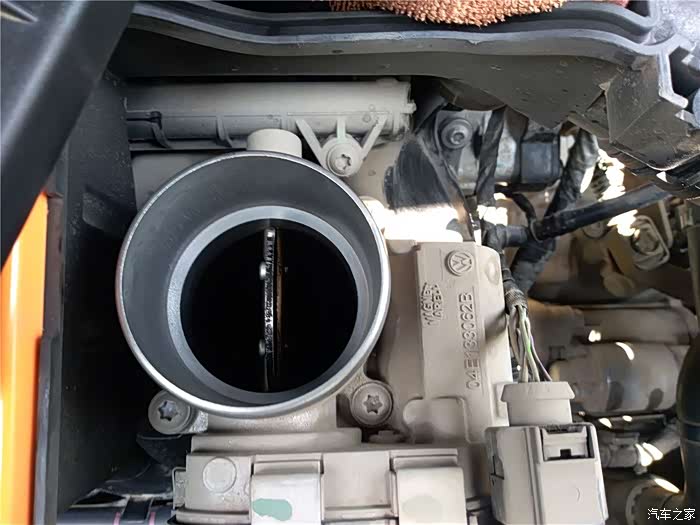 检查 拆掉发动机盖板后裸露在外面的节气门,比起三保的时候节气门明显脏了不少,从翻板的缝隙处就能看到积碳