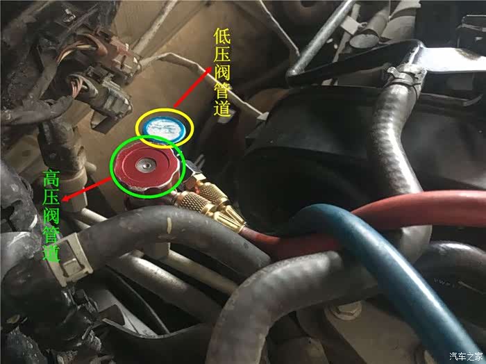 连接设备的有两根管子,细一点位于低一点的阀门是低压管道,平常我们用手去触摸是冰的,而位置偏高一点的管道是高压阀,它可是很烫的我们千万不要去触碰