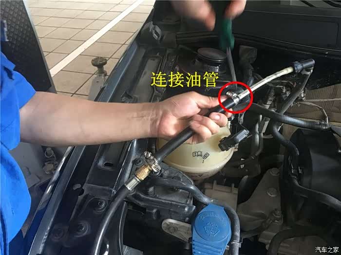 在此要注意的是:在启动发动机之前,询问保养师傅我们要做的就是拆下保险盒中燃油泵的继电器,使燃油泵停止运行,因为此时燃油总管并没有连接到任何设备,此时如果燃油泵持续抽油会导致从燃油总管里流出来