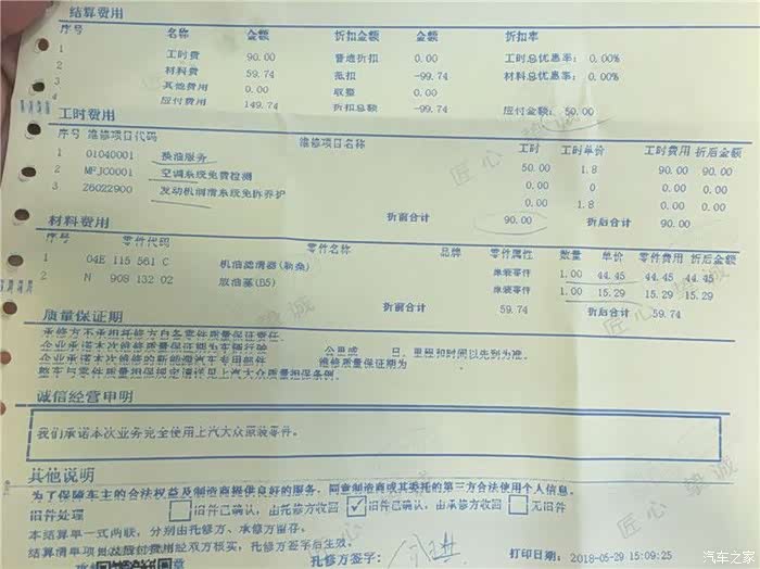 最后除去自带的机油跟养护套餐,使用抵扣劵只支付了工时费、放油螺栓与机滤的金额,共计100左右