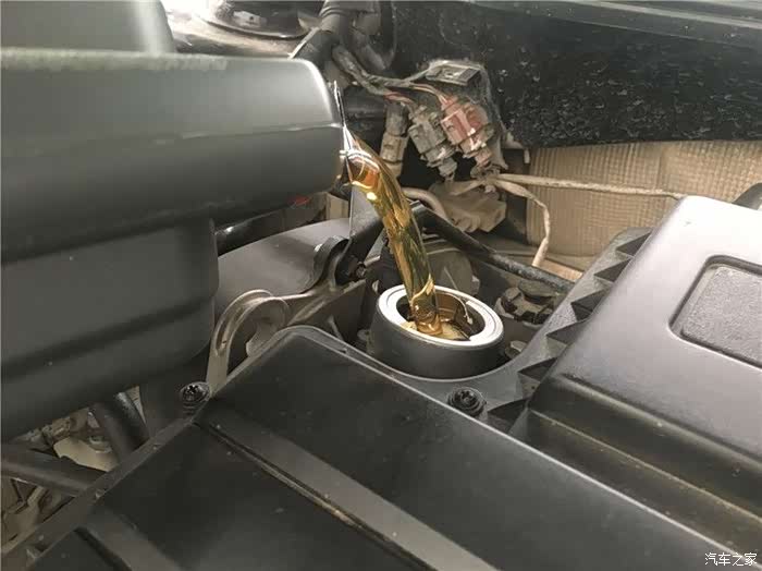 添加新机油,看起来很透彻,再去看看旧机油那么黑不敢想象啊