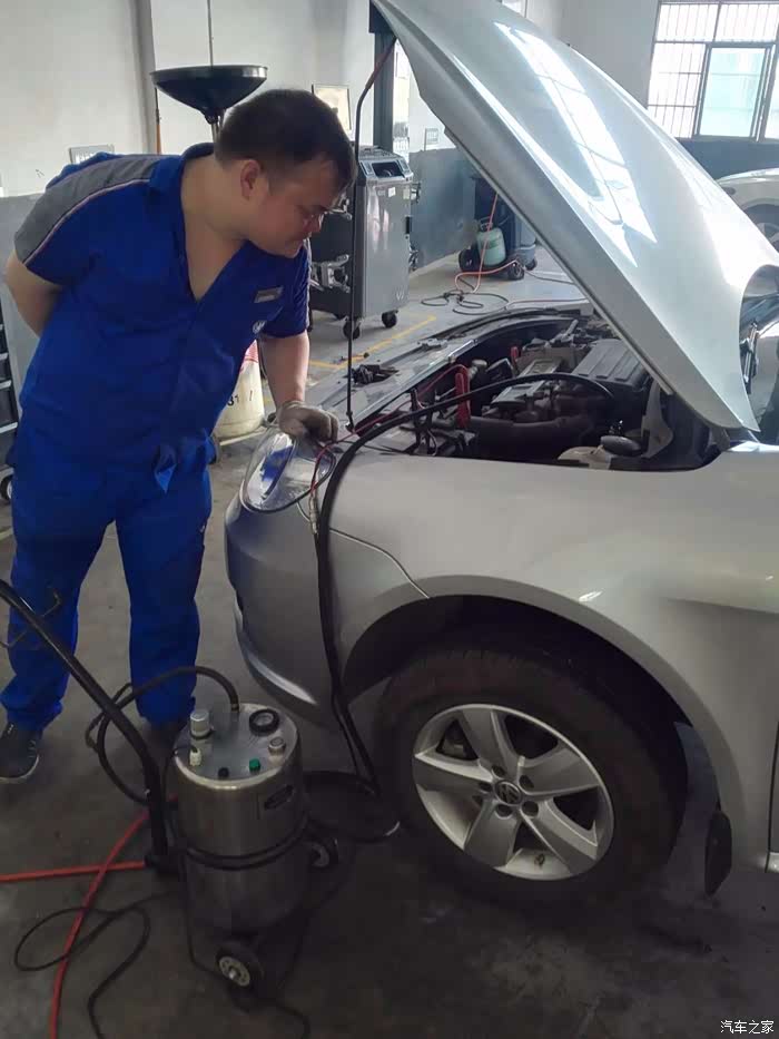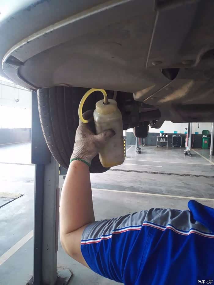 来到维修车间时不由的感叹4S店的效率,就这么一点时间就开始更换制动液了,新换的两瓶制动液已经灌装,我只看到旁边两个制动液空瓶了。据操作的技师介绍:更换制动液是一边灌装一边抽取。反正我不知道怎么操作,我只能在旁边看,一边再拍拍照片。
