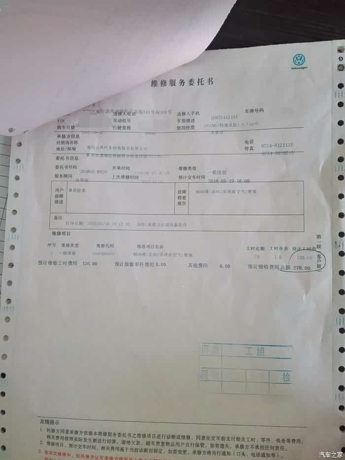 更换完后,一共278元含工时费,其中制动液2瓶共152元,工时费126元。结算完毕之后,去取车发现车子已经免费地清洗了一遍,虽不是很干净但毕竟还是服务比较周到。