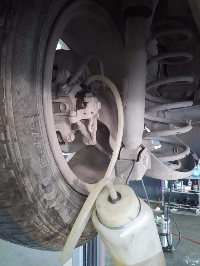 一段时间后,开始升起车辆,据介绍准备把以前的制动液放出来。拧开轮胎内侧边上的小螺丝,连接回收瓶,就开始有制动液慢慢流出来了。先放前面的就制动液,后放后面的制动液。