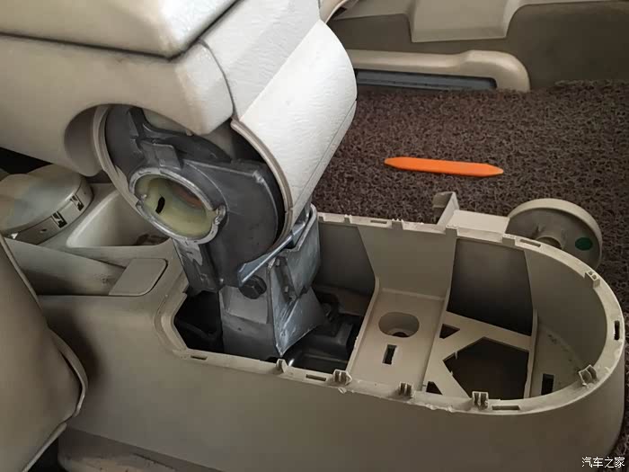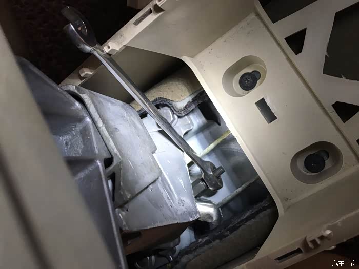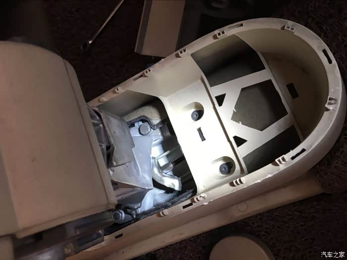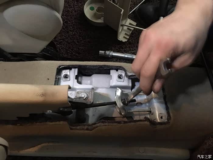 这个螺丝是调整手刹拉线的松紧的。如果拉线需要微调,只拆储物间就可以搞定。