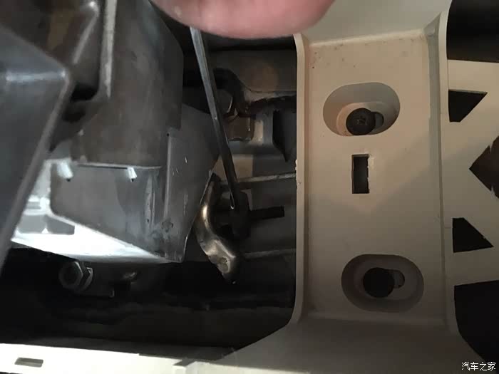 拆掉饰板就可以看到手刹拉线的固定螺丝,调整这个螺丝也可以。松开这个螺丝就可以将拉紧的手刹拉线取下来。