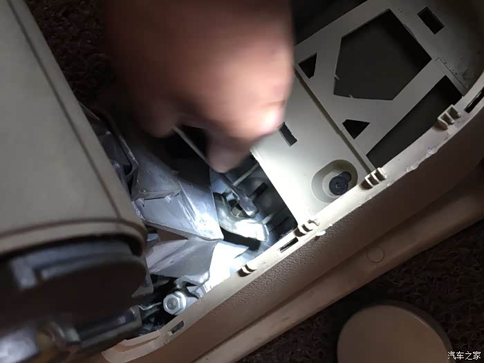 取下储物盒就可以看到手刹拉线,在手套箱的下方正中间有个螺丝。