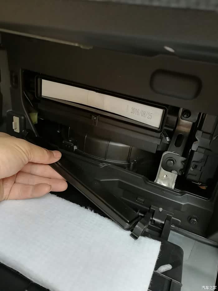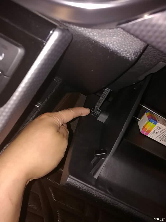 空调滤芯在哪里?在副驾驶前面的手套箱后面,这是手套箱的缓降拉杆,手指的位置往外一扣就开了