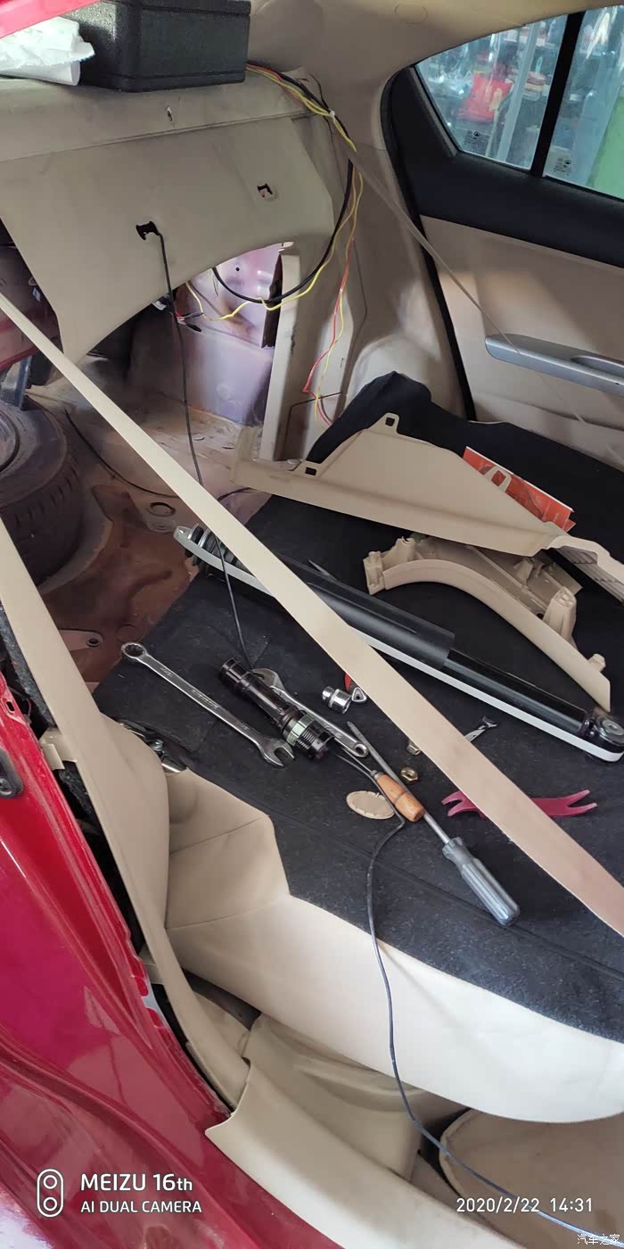 换之前就考虑要不要买原厂的件,开始有想过买原厂件,后来琢磨了一下,车老了将就一下吧!还是选择副厂的了,东西都是某宝上的,卖家人也不错细心解释。换件分为两个部分,有一部分是我自己换的,后减震器是我自己动手换下来的,由于修理店都关门,后边的简单索性就自己换了!开始拆内饰板的时候有点难拆,由于是塑料气温也低不好做工,不能来硬,要慢慢把卡子撬出来,经过一阵折腾终于拆下来了。