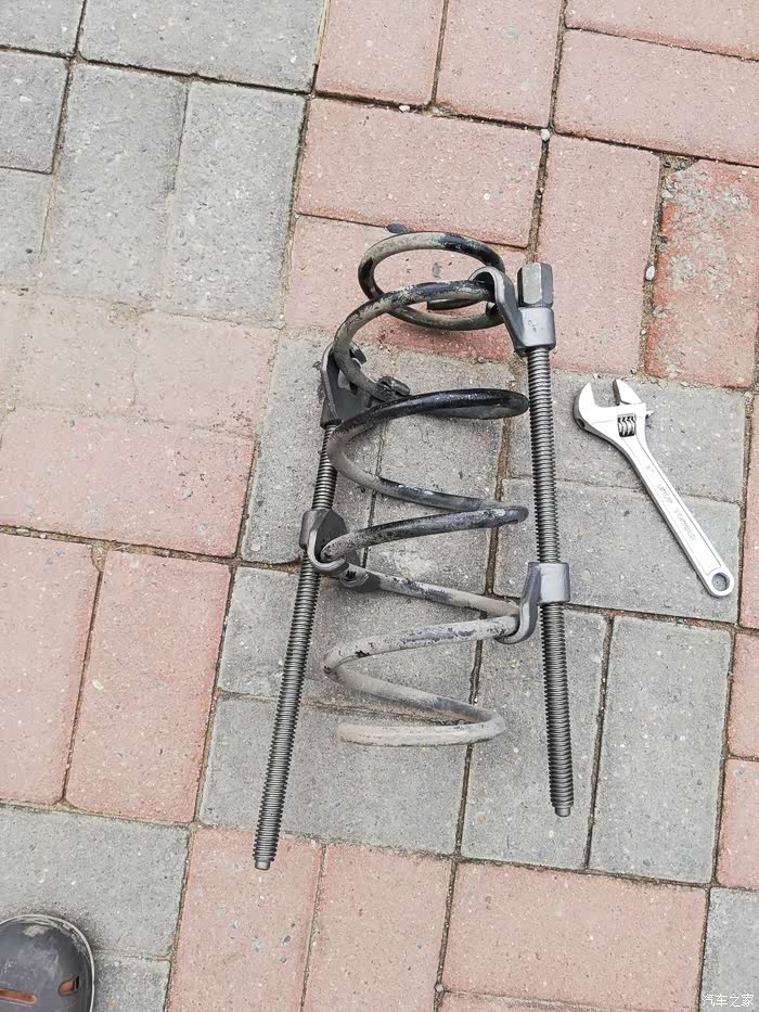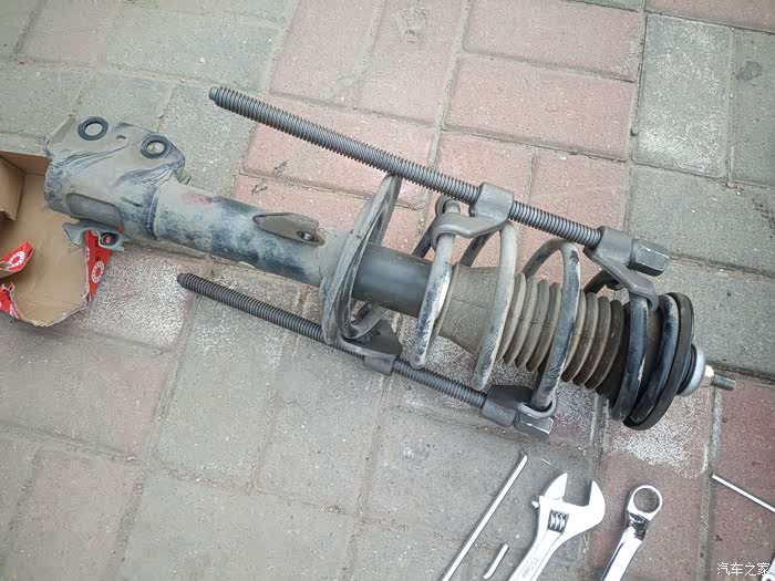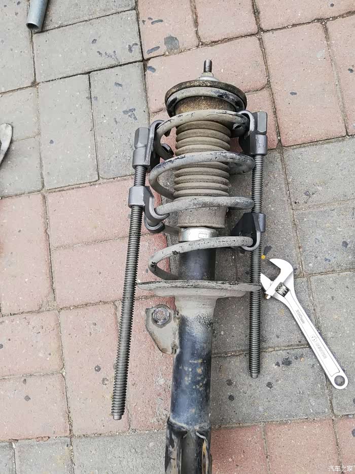 拆减震弹簧就得用到弹簧收缩器,弹簧在减震筒上是压缩状态,蓄能模式啊,否则你贸然拆开减震顶部的螺母是很危险的,弹簧突然弹出,后果不堪设想。自己拆,弹簧压紧器要用的