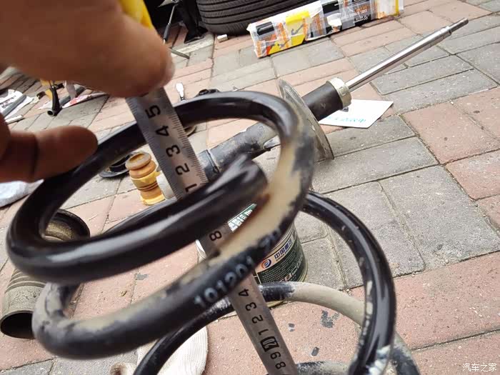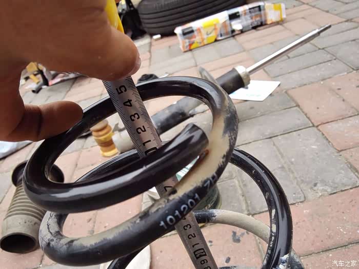 取出弹簧后,在依次松开两个压紧器,使弹簧恢复原长,测量弹簧的原来高度,35cm,与车友所说的一样,没有被屈服压短。也就是不用更换。另外,检查减震筒,压缩与拉伸都有阻尼,而且压下去后,也能及时的弹出至顶。减震筒也么有损坏。看减震筒,很快就回弹到顶了。说明没有坏。