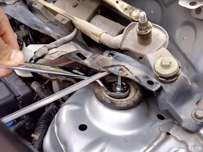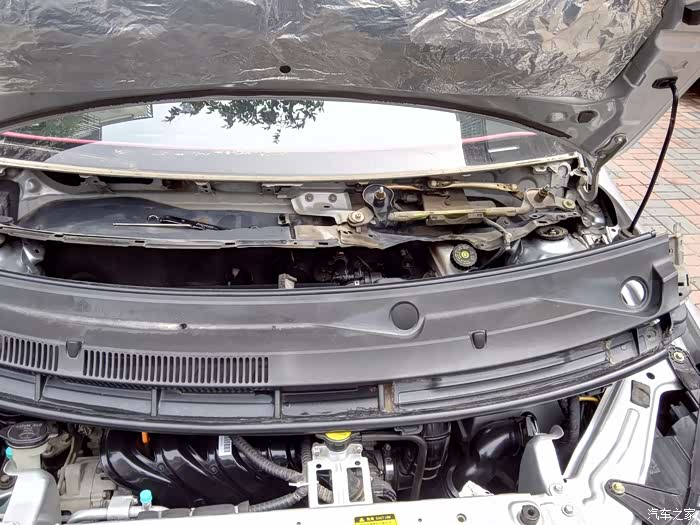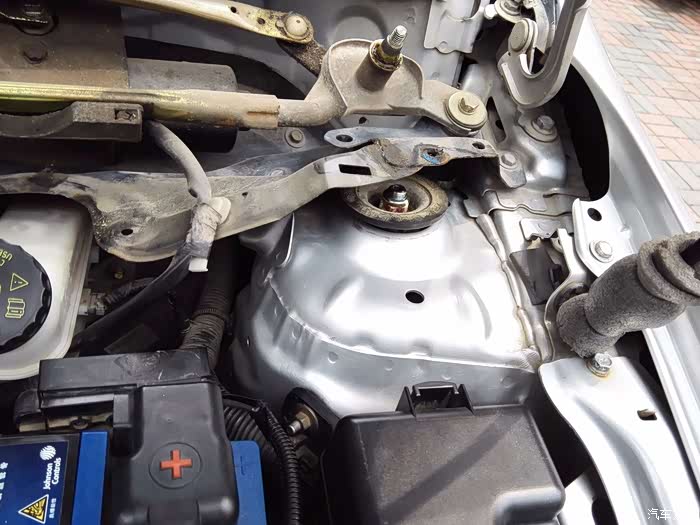 紧凑型车的弊端显现出来了,拆减震上面的螺丝,就得把集雨板拆掉,否则不方便施工,集雨盖板上面有2个压紧卡扣,下面靠近刹车油壶的地方还有一个卡扣,直接取出即可,另外还需要拆下雨刷,用14mm的套管。你若还有时间最好将集雨板整个拆下来,大大方便了施工,有几个固定的螺丝被雨刷电机系统压着,不拆电机不好弄。
