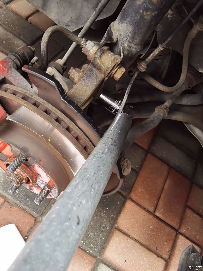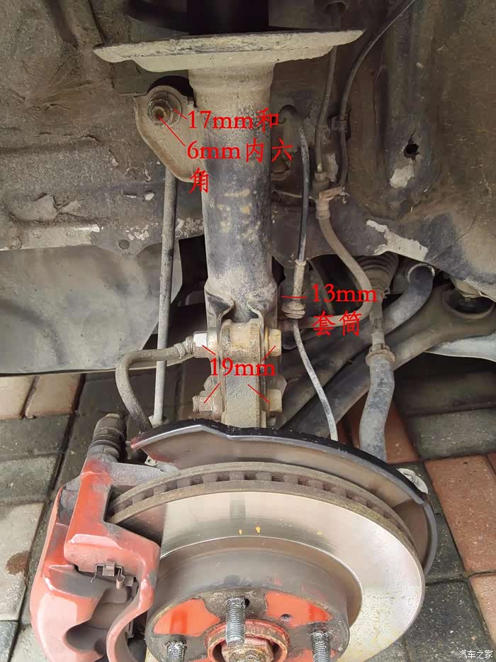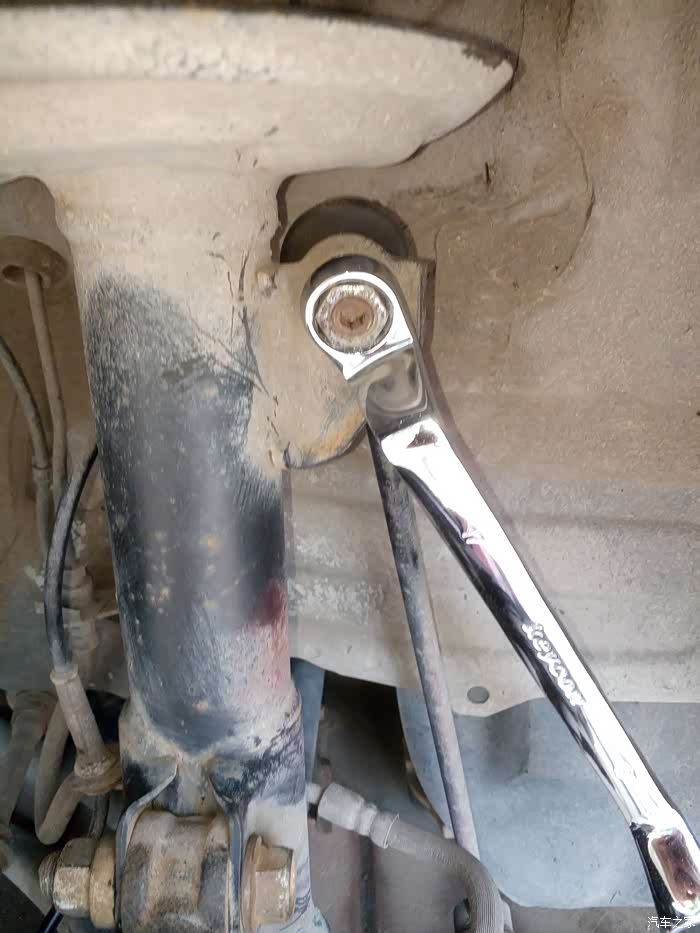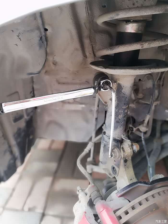 这个螺丝比较紧,可以使用锤头敲击扳手,这是减震连杆,稳定车身用的,向上有力,17mm扳手,卸掉螺母后,轻轻敲出螺栓,(注意,在安装时需要砖头顶柱刹车盘,降低车身,使减震弹簧压缩,