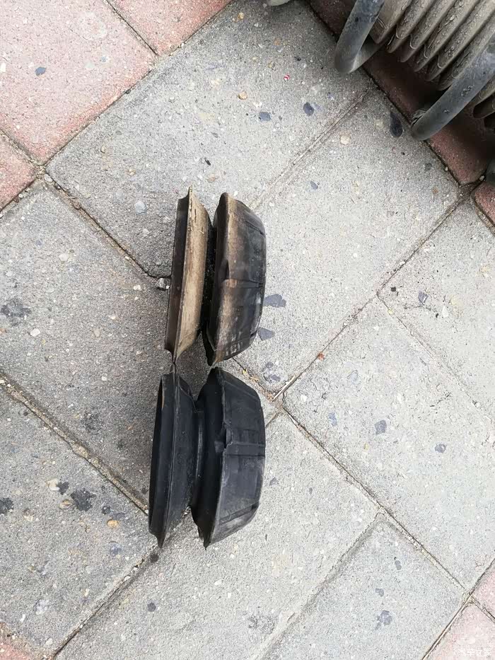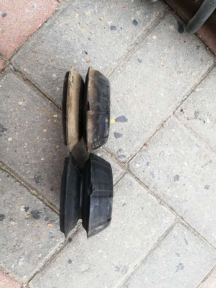 这是右顶胶与新顶胶的对比,矮了1cm,顶胶被压矮了,变硬而弹性差,路面颠簸时,震动过滤性不好。