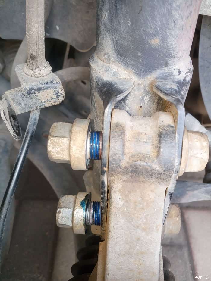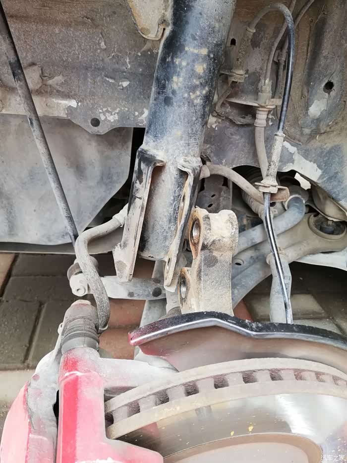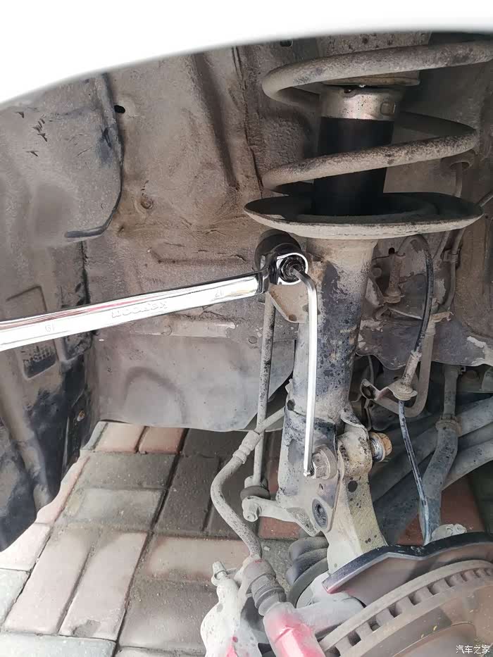 据车友的告诉我们,在拆轮胎前就要将这个螺丝松开,注意不要拧下来,送2圈即可,因为这个螺丝很紧,提前松开,有助于取出减震。