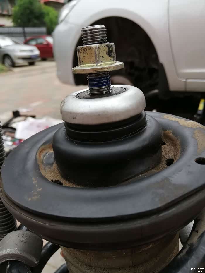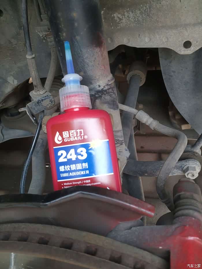 若是单纯更换顶胶,你是不用拆弹簧的,直接替换顶胶即可,因为顶胶在弹簧外面,这是换了新顶胶的减震系统,依次回装减震,记住每个螺母的位置,使用锁止胶忘记拍照了,借用安装右减震时用的锁止胶图片,就是这个东西。