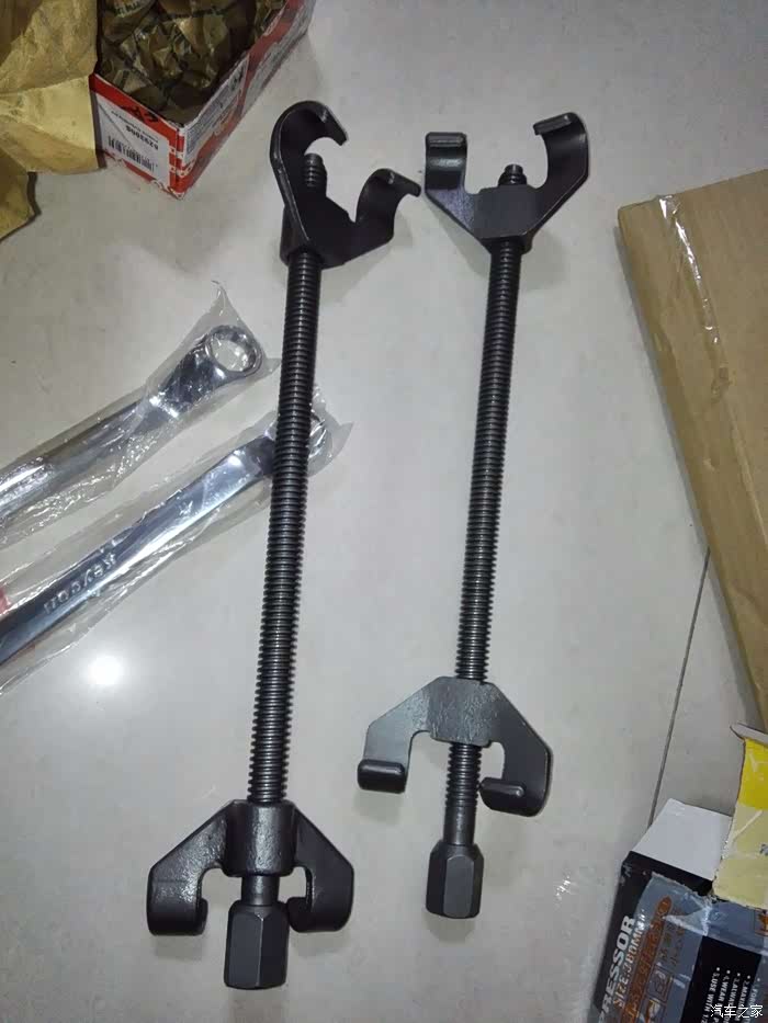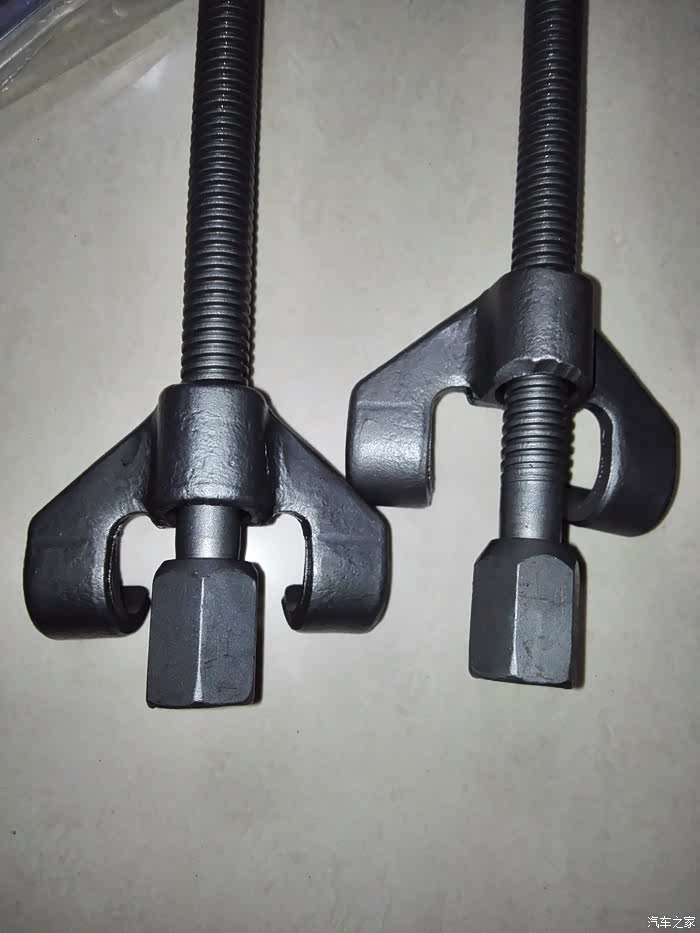 顺便检查了一下弹簧的原高,这就要拆下弹簧来测量,弹簧压缩器该上场了,压紧器对称的拉住弹簧,两边依次拧紧螺杆,弹簧压短松动后,就可以拆固定螺母了,